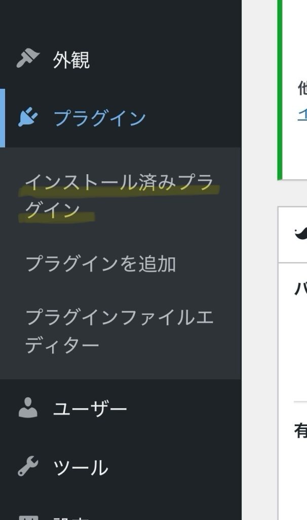 1. ワードプレスのサイドメニューのプラグインの中のインストール済みプラグイン一覧を表示する。