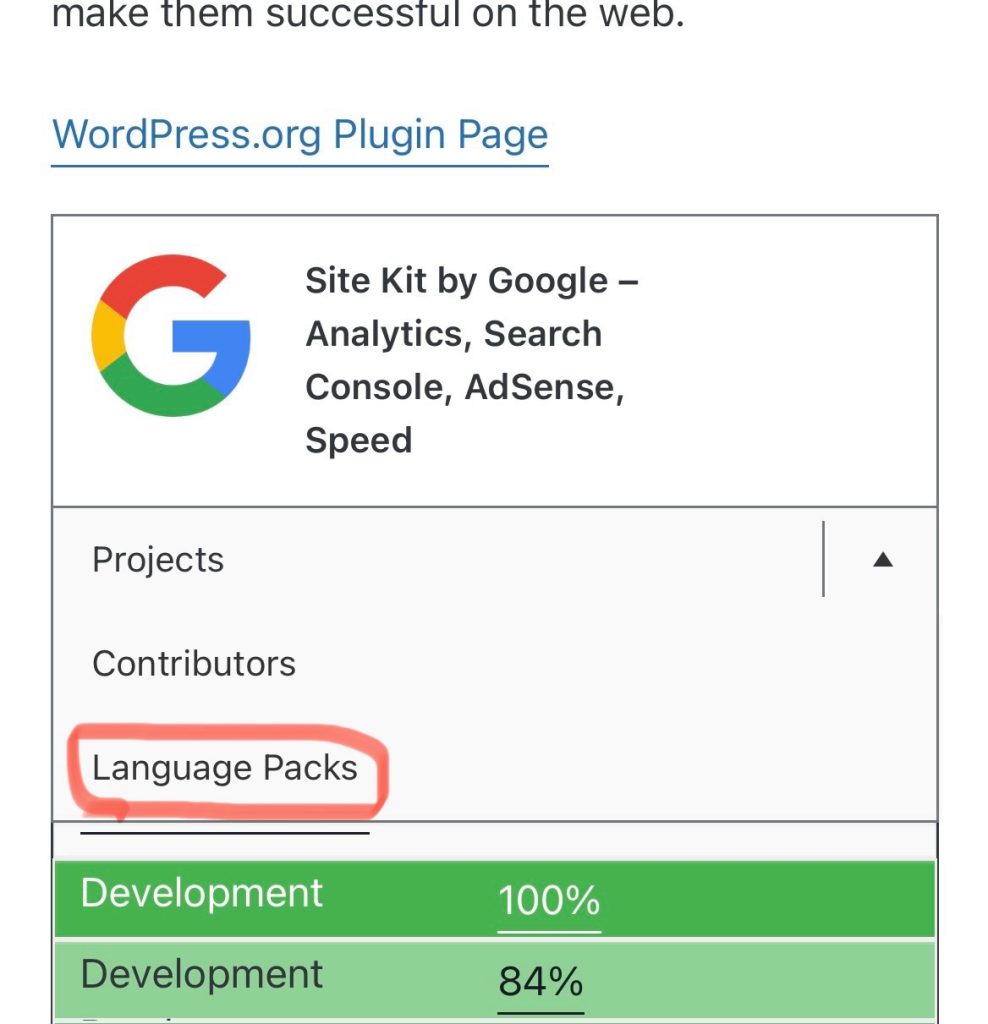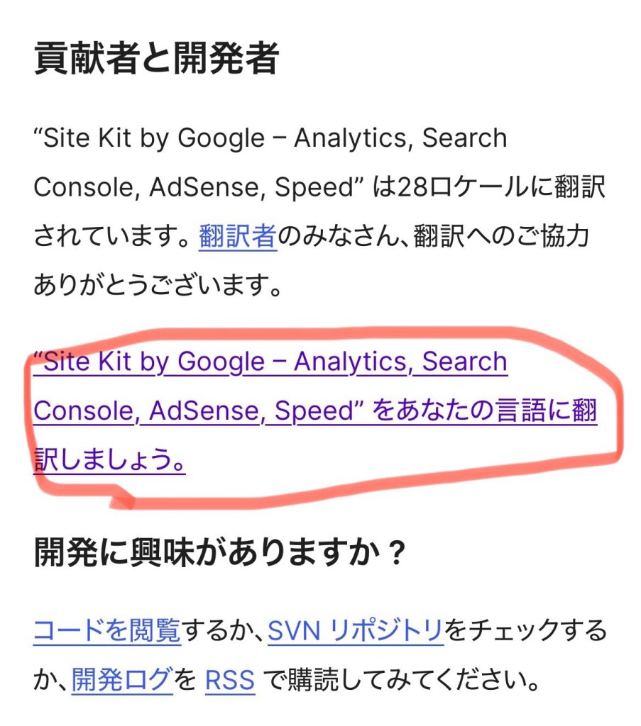 押すとその項目の下の文章が「貢献者と開発者」となるので、その中の「”Site Kit by Google – Analytics, SearchConsole, AdSense,Speed”をあなたの言語に翻訳しましょう。」を開く。