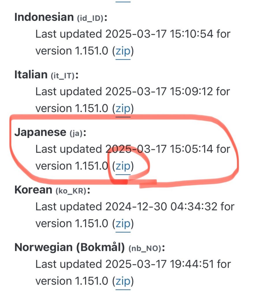Last updated 2025-03-17 15:05:14 for version 1.151.0 (zip)を見つけて(zip)を押す。