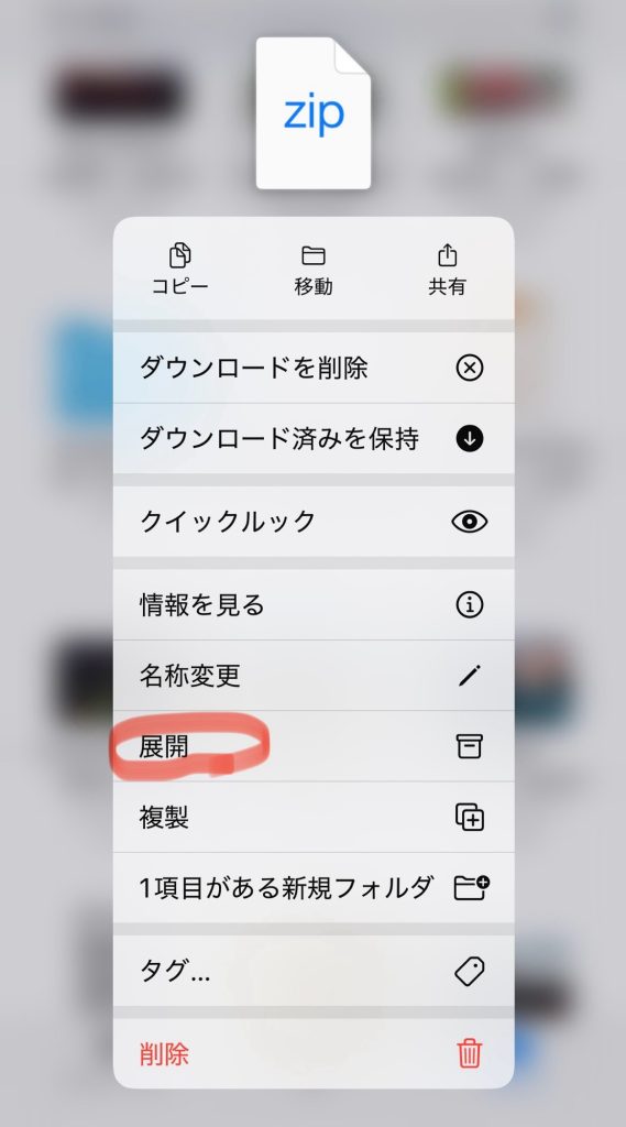 ※もし押しても始まらない場合はzipファイルを長押しするとメニューが表示されるのでその中の展開を押してください。